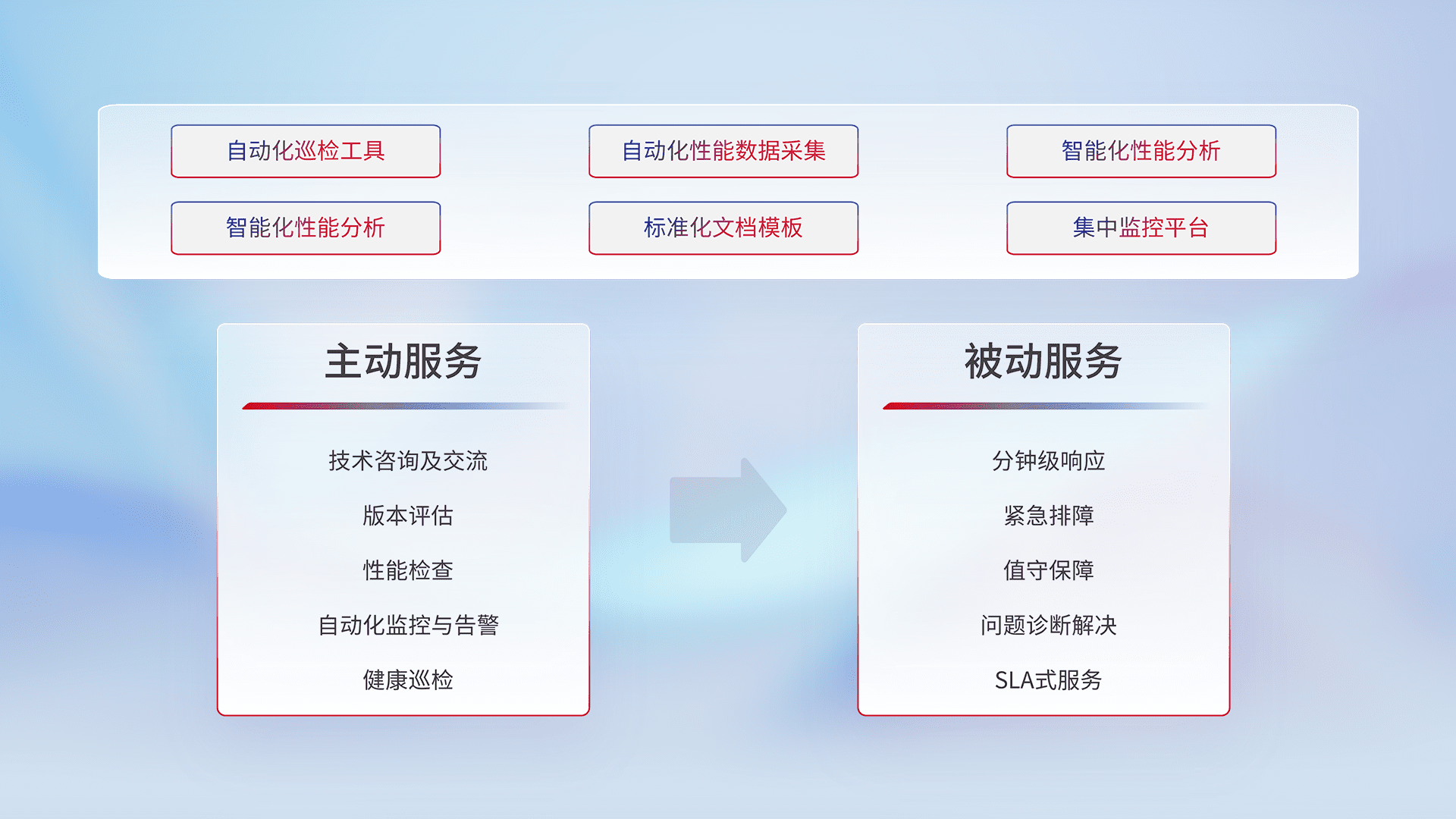 智能化工具和标准化文档,,,,保障服务质量,,,,提供主动服务(包含技术咨询、、版本评估、、、、性能检查、、自动化监控与告警、、、健康巡检)和被动服务包含(分钟级响应、、、、紧急排障、、值守保障、、问题诊断解决、、SLA服务)。。。。