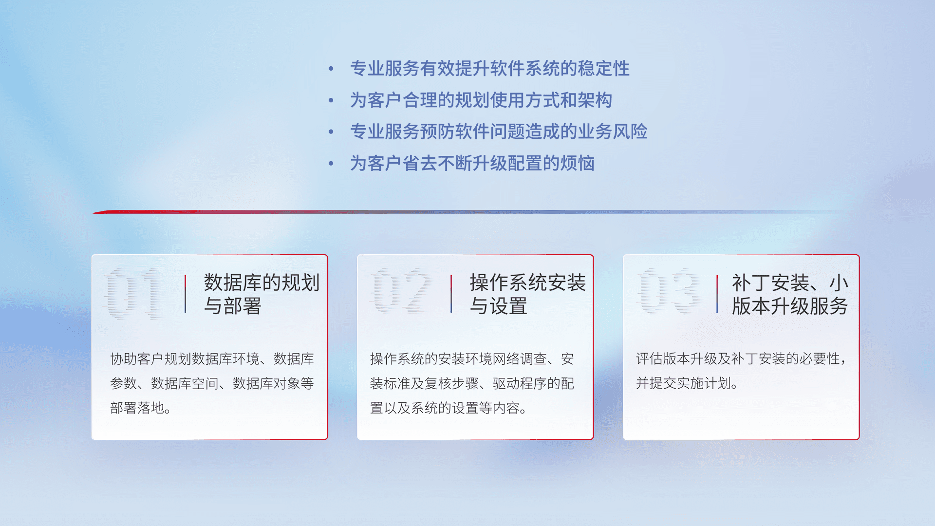 为客户提供软件规模升级、、、快速部署、、、、按需配置的专业服务,,,,从数据库的规划与部署到操作系统的安装与设置,,再到补丁安装和小版本升级提供支持。。。。