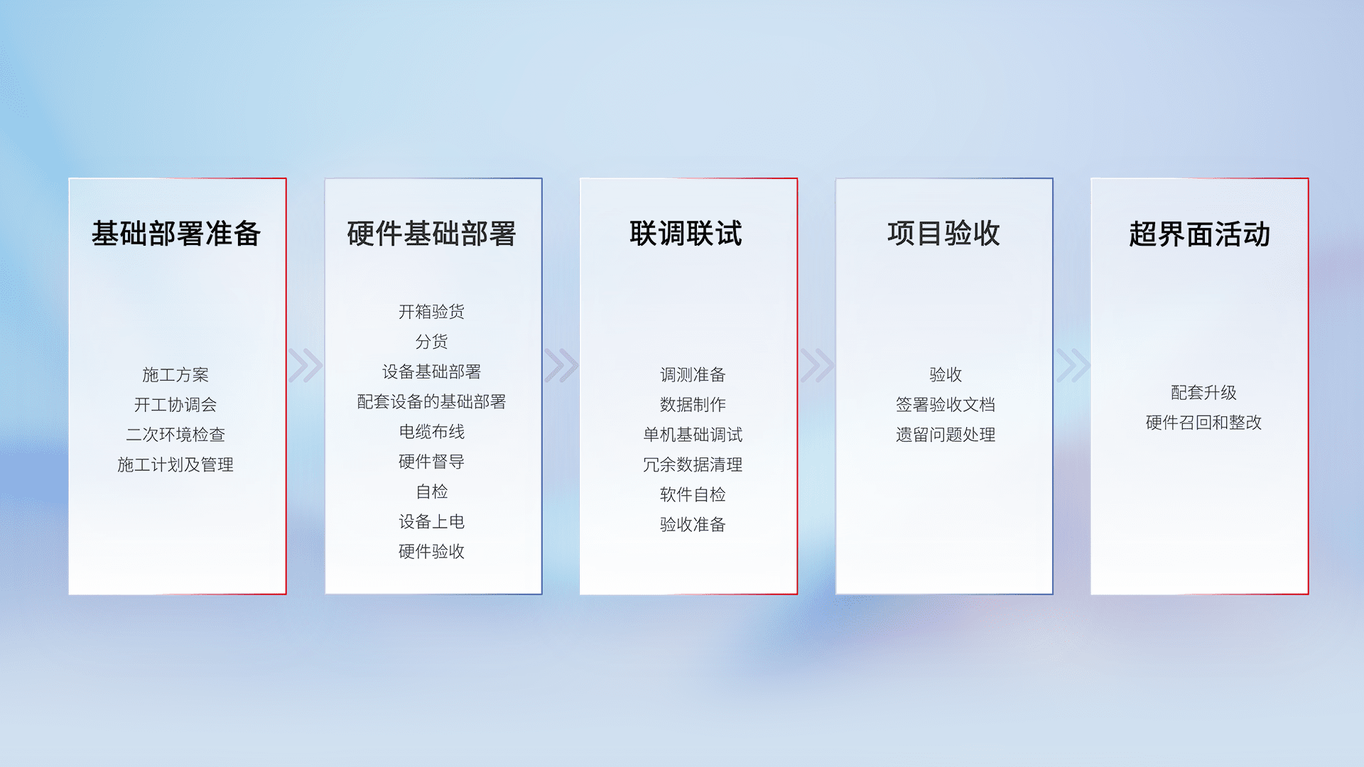 从基础部署准备、、、硬件基础部署、、、、联调联试、、、、项目验收、、、越界面活动的全过程可追溯,,,,保证施工质量和进度。。